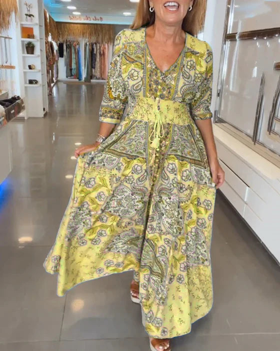 This dress combines a loose, flowing cut with a flattering V-neckline and three-quarter sleeves that stylise the silhouette and add a touch of sophistication. Its lightweight, breathable fabric makes it the perfect choice for spring, summer or any getaway in the sun.